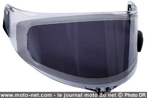 "La technologie LCD adhère parfaitement à l'écran et grâce à la structure des bords de petite dimension, elle ne limite pas la visibilité du conducteur et du passager", promet la marque de casques préférée de Valentino Rossi : le Docteur a posé avec l'équipement lors des récents tests au Qatar, mais n'a pas roulé avec (ça se verrait sur les photos... et ça figurerait sur le communiqué de presse !).