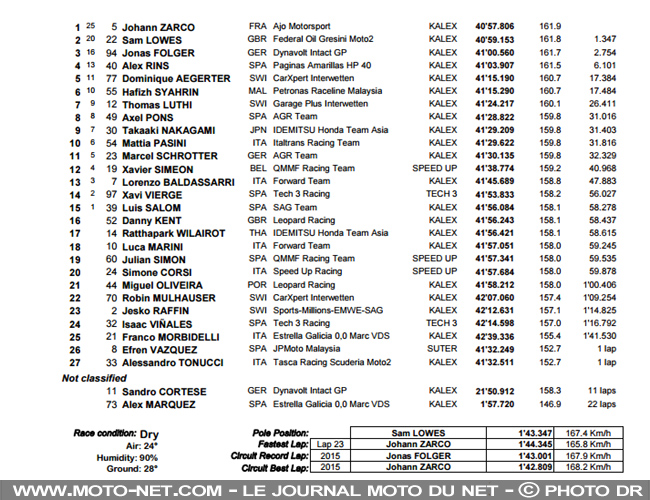 Le champion en titre hausse le rythme et passe Jonas Folger, repoussé à la 3ème avec Morbidelli à l'aspi. Johann prend quelques tours pour observer Sam Lowes, puis le double pour s'emparer du leadership. Le britannique s'accroche longuement aux basques du français, mais perd le contact à quelques tours de l'arrivée alors que Morbidelli se fait surprendre par une tâche d'humidité.