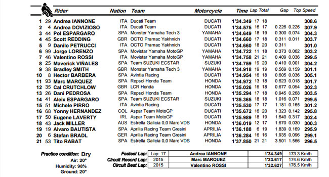 Le Docteur précède Maverick Viñales et Bradley Smith, tandis que Marc Marquez n'apparaît qu'au 11ème rang devant Cal Crutchlow, qui vient par ailleurs d'annoncer son maintien au sein de Honda-LCR pour 2017.