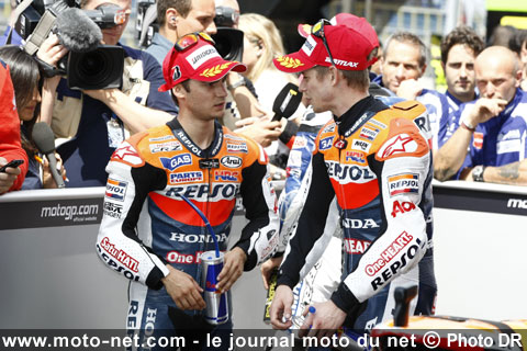 Casey Stoner, Honda-Repsol (1er en qualifs et 1er en course) : "Je suis vraiment ravi d'avoir eu la pole position puis la victoire, un grand merci à toute l'équipe ! J'espérais prendre un meilleur départ que celui que j'ai fait, creuser l'écart et tenir jusqu'à la fin. Nous savions qu'il fallait préserver le pneu arrière. En choisissant le pneu tendre, nous risquions de le détruire avant la fin de la course. Quand j'ai vu que Dani roulait à un bon rythme et que nous distancions les autres pilotes, j'ai décidé de le suivre et de préserver mes pneus et mon énergie".
