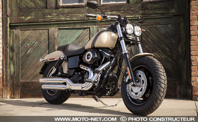 Le célèbre Harley-Davidson Fat Bob hérite de quelques retouches esthétiques en 2014 : si les pneus larges (130 mm à l'avant et 180 à l'arrière) et le double optique caractéristique sont conservés, le garde-boue arrière est désormais tronqué et la selle affinée, tandis que le feu arrière troque ses ampoules contre des leds.