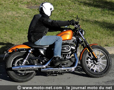 Cette relative compacité mécanique constitue le seul avantage du Sportster sur sa rivale en termes d'ergonomie, tant sa position de conduite n'est pas vraiment naturelle. Le guidon tend et lève légèrement les bras, suggérant de prime abord une posture typée "custom" : pieds en avant, bassin calé dans le fond de la selle et aisselles au frais...