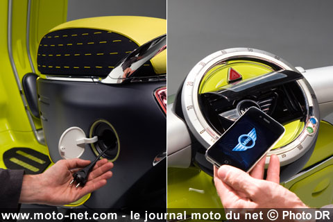 Moderne, il comprend une instrumentation stylisée qui prend "la forme d'un tube rempli d'un liquide qui se dilate", fantasme Mini... Et naturellement, on y glisse son Smartphone qui y joue le rôle de clé de contact, d'écran et d'élément de commande centrale !