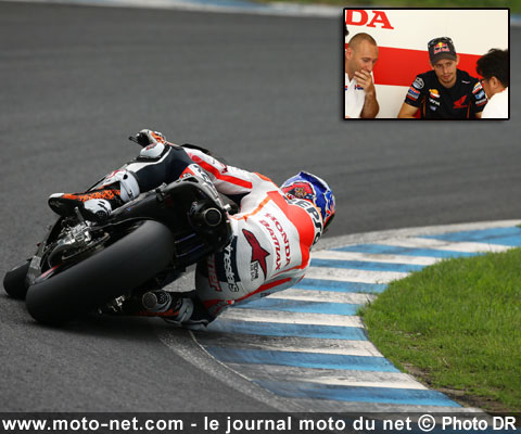 L'Australien a rejoint le HRC sur le circuit japonais du Twin Ring Motegi afin de tester la RC213V 2013 - la moto de Pedrosa et de Marquez -, ainsi que son évolution 2014. Cette séance de deux jours a débuté hier… sous un ciel maussade : Stoner est à peine sorti du box que la pluie s'abattait sur la région de Tochigi !