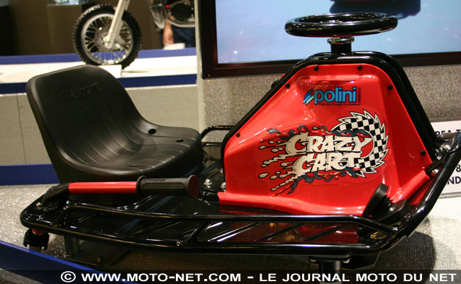 Prenez un petit moteur électrique capable de taquiner les 20 km/h, deux roues libres de caddy et un siège de bureau recyclé... et vous obtenez le Crazy Cart, une caisse à savon réservée aux enfants de plus de 9 ans ! Ce truc un peu barré se dirige soit avec le volant en prise directe avec la roue avant motrice, soit à "coups de frein à main" pour déclencher des cascades plus ou moins contrôlées (voir la vidéo de démonstration). "Et quel est le rapport avec la choucroute ?", se demanderont sans doute nos lecteurs... Aucun, si ce n'est que ces "kart fous" sont distribués en Italie par le spécialiste de pièces détachées pour petites cylindrées Polini, d'où leur présence à l'EICMA ! |