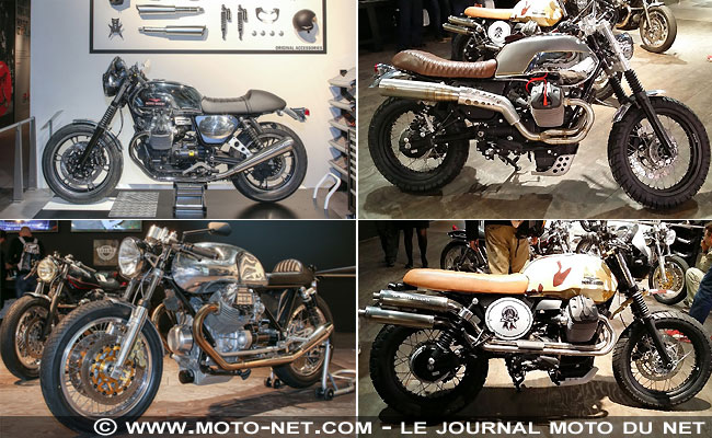 | Moto Guzzi exposait plusieurs préparations intéressantes à l'arrière de son stand, dans un espace nommé "Moto Guzzi Garage". Avec notamment la très belle réalisation sur base de V7 conçue pour célébrer les 10 ans du préparateur Millepercento (en bas à droite). |