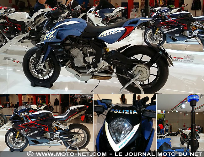 En France, les motards de la police chevauchent des BMW R1200RT ou des Yamaha 1300 FJR, en Italie ce sont des Rivale 800 ! C'est en tout cas la démarche que souhaiterait développer la marque de Varese avec cette version "full équipée" : sirène deux-tons, feux additionnels, radio et gyrophare monté sur une longue tige à l'arrière ! - "Et le radar, on le met où, chef ?" Notez aussi la très belle F4 spécialement conçue pour célébrer les 200 ans des fameux "carabiniers" italiens. |
