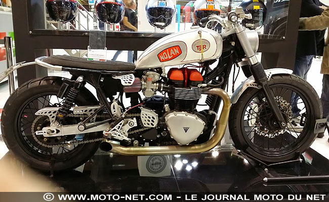 Nolan dévoilait à l'EICMA plusieurs nouveaux casques dont les jets N21 et N21 Visor (avec écran solaire rétractable), déclinés en plusieurs décorations dont certaines assez vintage. Afin de plonger le visiteur dans l'ambiance, le groupe italien (propriétaire des marques Nolan, X-Lite et Grex) exposait une superbe préparation à ses couleurs sur base de Bonneville. Une "Bonnie" méchamment encanaillée grâce à sa partie arrière allégée, ses échappements quasi libres (bonjour le barouf !), ses platines reculées taillées dans la masse, son gros filtre à air ou encore ses disques à pétales. |
