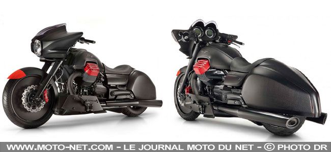 Propulsé par l'énorme v-twin de la California 1400, ce prototype MGX-21 se veut une interprétation futuriste de la catégorie Bagger vue par les designers de Moto Guzzi. L'arrière profilé à la façon des "cigares" créés pour les records de vitesse laisse tout simplement sans voix ! Les petites touches de rouge sur les étriers Brembo, l'extrémité du garde-boue avant et les culasses du bicylindre apportent une intéressante touche de sportivité. La roue avant de 21 pouces avec enjoliveur et l'habillage faisant la part belle au carbone font aussi sensation mais Moto Guzzi n'a donné aucune information technique sur ce proto réalisé par Miguel Galluzzi. |