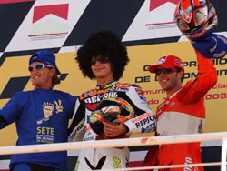 Soudain Perugini chute et perd la place de vice champion du monde ! Dans le dernier gauche, Barbera passe à l’extérieur de Stoner qui fermait la porte, mais sort large au-delà du vibreur et voit Stoner et Jenkner le passer à l’entame de la ligne droite d’arrivée ! Dovizioso se rate et tire droit dans le bac à graviers ! Stoner peut alors remporter son premier grand prix à 18 ans, devenant le 9ème vainqueur de la saison en 16 courses ! Jenkner et Barbera complètent le podium. Simoncelli finit seul 4ème, ses deux adversaires étant allés à la faute dans ce dernier tour à rebondissements ! Giansanti est 5ème, Bautista 6ème, Nieto 7ème et Dovizioso 8ème. Cecchinello, 9ème, s’effondre en larmes sur sa machine sous le coup de l’émotion la ligne à peine franchie. Emilio Alzamora, qui lui aussi raccroche le cuir, jettera ses gants et son casque au public espagnol pendant que Barbera est porté en triomphe par ses fans.