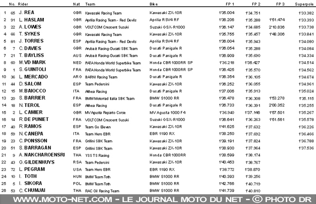 Repêché en SP1, Michael van den Mark (Honda Pata) a tourné une seconde moins vite que Jonathan Rea, mais se console partiellement en devançant - de cinq centièmes de seconde ! - son coéquipier, notre compatriote et champion du monde 2014 : Sylvain Guintoli.