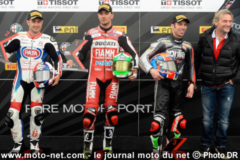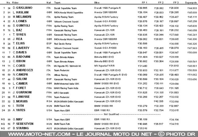 Eugene Laverty (Suzuki Voltcom Crescent) et Chaz Davies (Ducati SBK) justement, sont passés à côté de "leur" épreuve de Superpole et partiront demain des 10ème et 11ème places sur la grille. Deuxième de la SP1 mais victime d'une chute, Ayrton Badovini (Bimota Alstare) n'a pas pu défendre ses chances en SP2 et obtient la 12ème place.