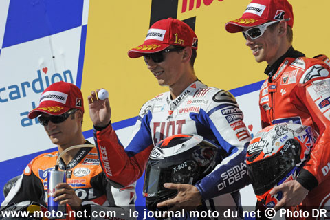 Certes, Rossi a été le premier à s'imposer lors de l'ouverture de la saison au Qatar - bien aidé par la chute de Stoner, souligneront certains de nos lecteurs - et son effroyable cabriole lors des essais du Grand Prix du Mugello a compromis ses chances de disputer le titre cette année. Cependant, si son absence lors des Grands Prix d'Italie, de Grande-Bretagne, des Pays-Bas et de Catalogne a mathématiquement avantagé Lorenzo, ce dernier n'a pas manqué l'occasion de battre, à la régulière et avec le même matériel, son chef de file à Jerez et au Mans !