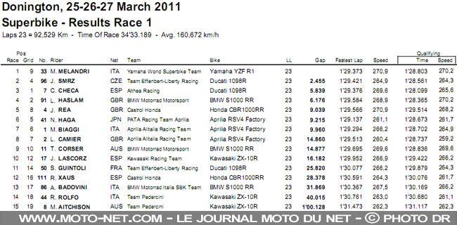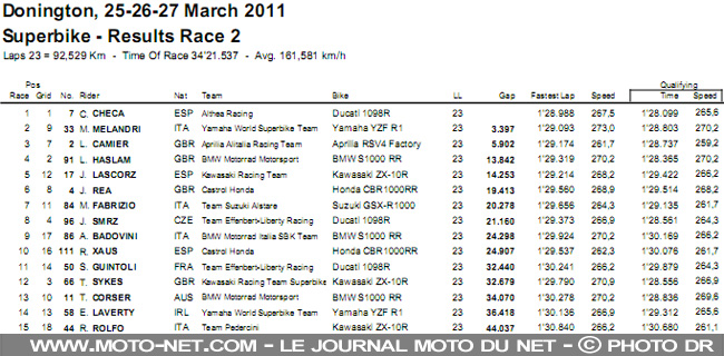 Smrz n'a pas démérité sa 2ème place et est rejoint sur le podium par une autre Ducati ! À deux virages de l'arrivée, Carlos Checa a en effet réussi à surprendre Leon Haslam qui termine 4ème. Suivent les trois Aprilia de Haga, Biaggi et Camier puis la BMW de Corser et la Kawasaki de Lascorz.
