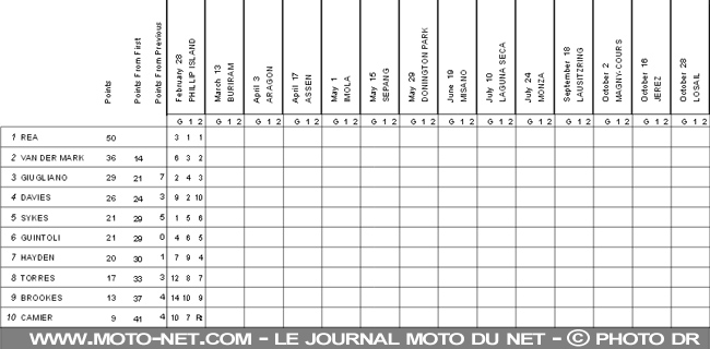 Fort de son doublé australien, Jonathan Rea s'installe en tête de "son" championnat World Superbike. À 14 points du score parfait, Michael van den Mark s'empare de la deuxième place. Il est suivi par Giugliano, Davies (10ème de la seconde course), Sykes et Guintoli.