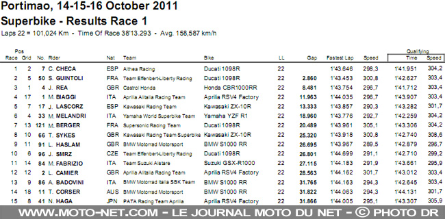 Jonathan Rea complète de nouveau le podium aux commandes de sa Fireblade, devant les Ducati de Checa et Guintoli et les Aprilia officielles. La marque de Noale s'incline donc face à Yamaha au championnat des constructeurs (429 points contre 450), loin derrière Ducati et ses 529 points !