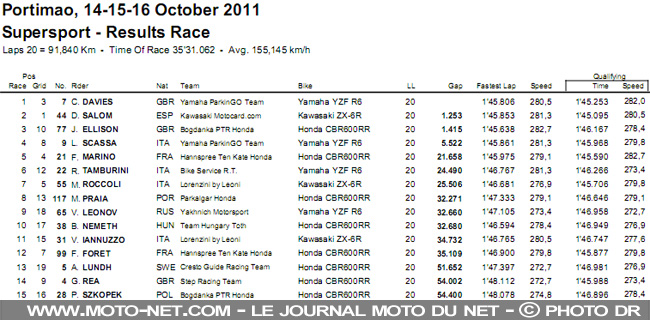 La seconde est la bonne : la ZX-6R n°44 pique la 2ème place de la CBR600RR n°44 et la conserve jusque sous le drapeau à damier, que Davies a franchi une bonne seconde plus tôt. Luca Scassa termine 4ème à 5,5 sec de son coéquipier champion du monde, Marino 5ème à plus de 21 secondes !