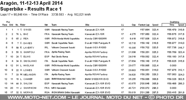 Entre temps, Chaz Davies s'est emparé de la quatrième place sur sa Ducati. Eugene Laverty hisse sa Suzuki à la cinquième place devant les Aprilia de Sylvain Guintoli et de Toni Elias. Les britanniques Leon Haslam et Alex Lowes complètent le "Top ten".