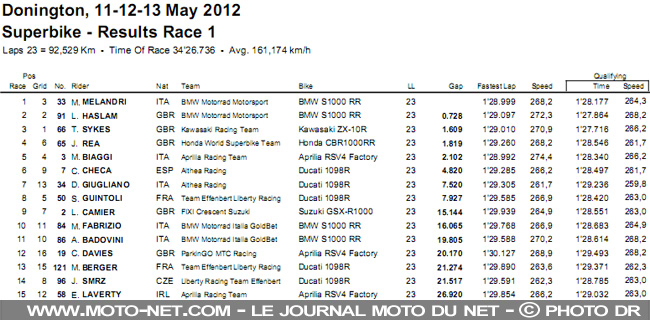 Rea profite d'un léger écart de Biaggi pour obtenir la quatrième place. Haslam pour sa part donne tout pour remonter sur Melandri. Cette ultime assaut lui permet de larguer Sykes mais Marco est trop loin. C'est donc à l'Italien que revient l'honneur de remporter la première victoire sur la Superbike BMW !