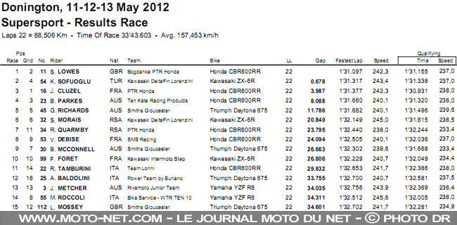 Sofuoglu ne le quitte pas d'un pneu - Pirelli, what else ?! -, alors que Cluzel un peu plus brouillon perd du terrain. Valentin Debise est en pleine bagarre face à Quarmby pour le gain de la 7ème place, Foret occupe la 10ème place, Lanusse la 19ème.