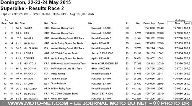 Tom Sykes a remporté une seconde victoire magistrale cet après-midi à Donington Park et signe son troisième doublé consécutif sur le tracé anglais ! Passé tout près d'une vilaine chute, Rea assure une nouvelle 2ème place devant Davies. Seconde course Superbike Très réactif, Jonathan Rea part dans un petit mais long…