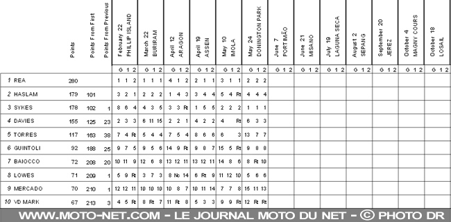 Chaz Davies perd un peu de terrain sur les leaders (23 points de moins que Sykes) mais en gagne beaucoup sur les outsiders Torres, Guintoli et Baiocco. Mercado profite de la série noire de Van den Mark (trois marques nulles) pour accéder à la neuvième place du provisoire.