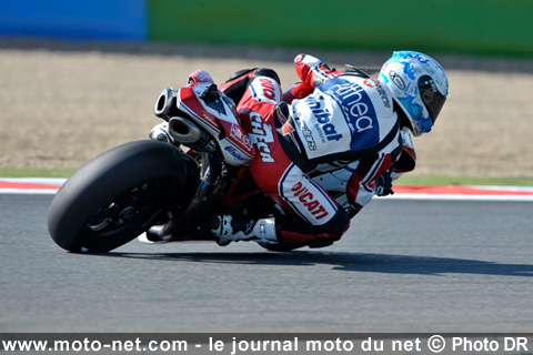 Eugene Laverty réalise l'exploit de s'intercaler entre les deux Ducati, pourtant séparées l'une de l'autre par moins d'un dixième de seconde ! Vainqueur de l'épreuve française de Supersport l'an dernier sur sa CBR600RR, l'Irlandais confirme que la Yamaha R1 est diablement bien adaptée au circuit de Magny-Cours.