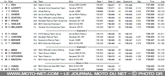 En Superpole 2 - alors que Sykes battait déjà le record de Crutchlow - Maxime Berger parvenait à devancer Troy "Mister Pole" Corser. Notre second représentant national se qualifie finalement en 11ème position derrière Joan Lascorz et sa Kawasaki...
