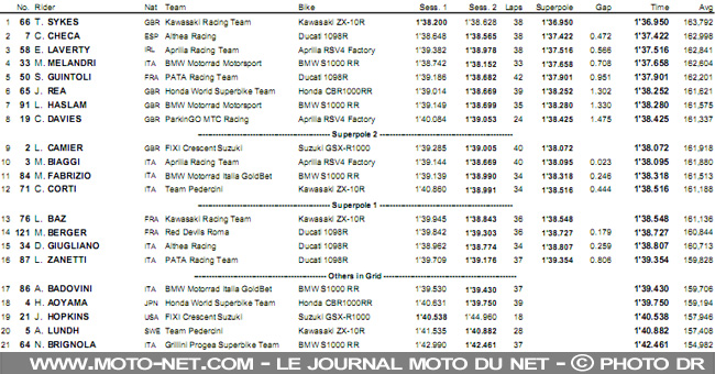 Le Frenchie devancera sur la grille pas moins de quatre Britanniques : Jonathan Rea et sa Fireblade n°65 déjà aux couleurs 2013, Leon Haslam et sa S1000RR n°91, Chaz Davies et sa RSV4 n°19 et Leon Camier et sa GSX-R 1000 n°2. Autant de gros clients que Max Biaggi devra dépasser pour décrocher ses chères sixièmes places...