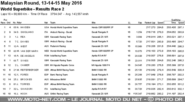 La pluie a largement redistribué les cartes de cette seconde manche 2016 à Sepang. Le grand gagnant est le pilote Honda n°69, Nicky Hayden : le champion américain de MotoGP remporte en Malaisie sa première course WorldSBK...