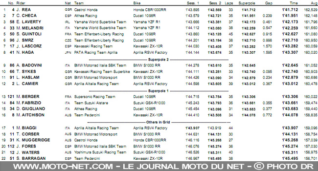 Le n°1 - pour deux courses encore - partira devant Troy Corser et une ribambelle de remplaçants : Karl Muggeridge sur la CBR de Xaus, Javier Fores sur la S1000RR de Toseland, Santiago Barragan sur la ZX-10R de Rolfo. Au milieu d'eux également, le pilote wildcard Josh Waters sur sa Suzuki Yoshimura.