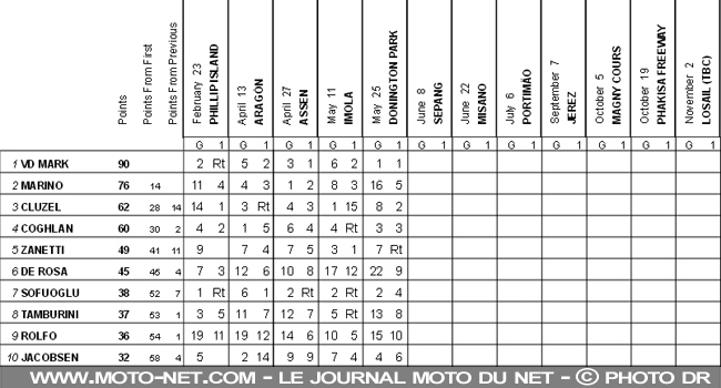 Cluzel retarde ensuite au maximum son freinage dans Melbourne et élargit très légèrement... Van den Mark n'en demandait pas tant et glisse sa Honda sous la MV Agusta de notre compatriote ! Michael gère parfaitement la dernière épingle et remporte sa seconde victoire cette saison, devant Cluzel et Coghlan.