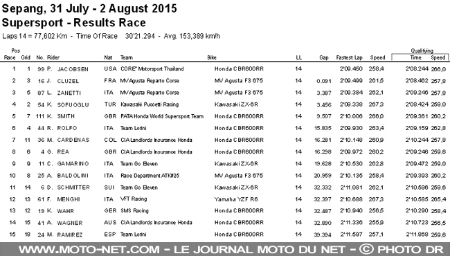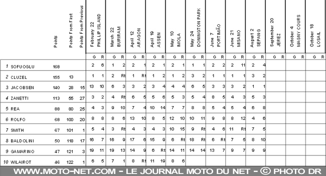Trois secondes plus tard, Zanetti déboule devant Sofuoglu sous le drapeau à damier. Le pilote turc laisse ainsi filer trois points de plus au championnat : Kenan totalise 168 points contre 155 pour Jules... et 140 pour Patrick toujours en lice pour le titre, tout comme Lorenzo d'ailleurs (113 points).