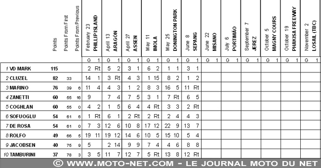 Fort de sa deuxième victoire consécutive, Michael van den Mark augmente son avance au championnat de cinq points sur son dauphin Jules Cluzel (115 points à 82). Florian Marino n'inscrit aucun point à Sepang et voit remonter sur lui Lorenzo Zanetti. Kenan Sofuoglu totalise 54 points et partage la sixième place avec De Rosa.
